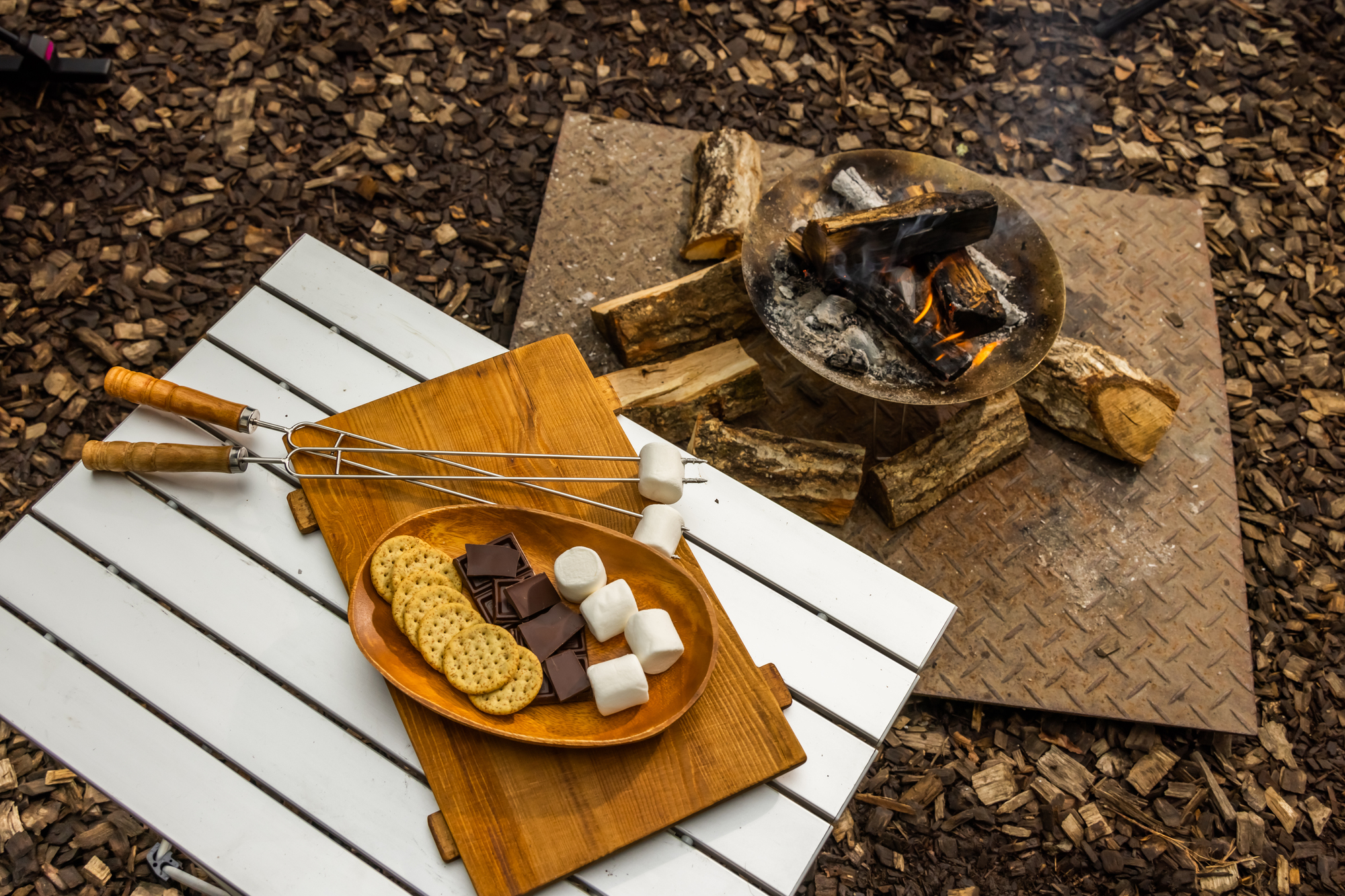 焚き火で調理できるおしゃれなデザートといえば、チョコレートビスケットで軽く炙ったマシュマロを挟んだスモアです。マシュマロは焦げてしまわないよう、串に刺したまま様子を見ながらゆっくり焚き火に近づけましょう。